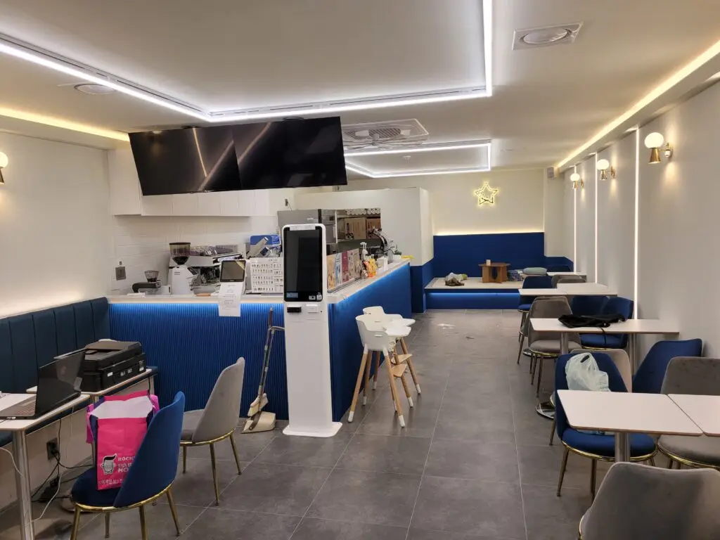 부산 소형 카페. 블루 컬러 포인트와 LED 조명으로 브랜드 감성을 살렸습니다